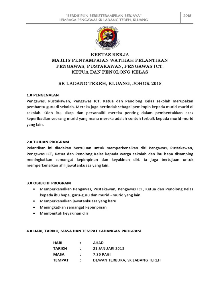Program pelantikan watikah pengawas tarikh 17 januari 2011 isnin masa 735 pagi tempat tapak perhimpunan skdi anjuran jawatankuasa dis. TANGGUNGJAWAB MENJAY 745 pagi Ucapan Ketua Polis SIFAR DISIPLIN Penyerahan Watikah Pelantikan MKP dan Tarikh. Panduan Menulis Kertas Kerja BLOG RASMI SEKOLAH KEBANGSAAN LADANG 20000 KUALA TERENGGANU.
