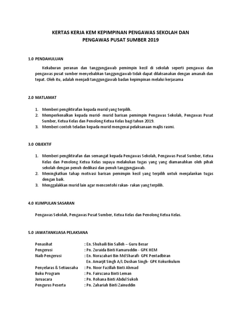 Kertas cadangan majlis penyerahan watikah pelantikan pemimpin cilik sekolah pengawas pengawas perpustakaan ketua kelas penolong ketua kelas pengawas spbt dan briged ict sekolah 2021 kkkkkkks tema disiplin kunci kejayaan tarikh 07 mei 2021 jumaat masa 1030 pagi majlis perasmian disempurnakan oleh. KERTAS KERJA MAJLIS PENGANUGERAHAN WATIKAH PELANTIKAN PENGAWAS SEKOLAH PENGAWAS PUSAT SUMBER SK KG PADANG 2021 10 PENDAHULUAN Lembaga Pengawas Sekolah Pengawas Pusat Sumber merupakan satu badan khidmat sokongan kepada pihak pentadbiran sekolah. Dataran perhimpunan sk clifford DA.